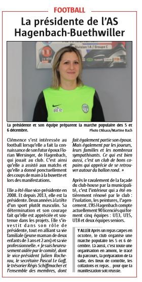 Elle a été élue vice-présidente en 2008. Et depuis 2013 elle la présidente, deux années à la tête d’un sport plutôt masculin. Sa détermination et son courage font qu’elle est appréciée et soutenue dans les projets. Elle s’investit dans son rôle de présidente, tout en alliant sa vie familiale (jeune maman de deux enfants 3 ans et 2 ans) et sa vie professionnelle. « Je suis heureusement aidée par le comité, dont le vice-président Julien Rochereau, le secrétaire Pascal Le Goff, le trésorier Régis Schiffmacher et l’ensemble des membres, dont fait également partie son époux. Mais également par les joueurs, leurs familles et les nombreux sympathisants. Ce qui est bien aussi, c’est un club de bons copains qui apprécie de se retrouver autour du ballon rond ». Après le ravalement de la façade du club house par la municipalité, c’est l’intérieur qui a été entièrement rénové : l’isolation, les peintures, l’agencement, par le club. L’AS Hagenbach compte actuellement 90 licenciés qui forment 5 équipes : U13, U15, U18 et 2 équipes séniors. Après le repas carpes en octobre, le club organise la prochaine marche populaire qui aura lieu les 5 et 6 décembre. Là aussi c’est toute une organisation en amont, le tracé du parcours, la préparation de la salle, des lieux de contrôle, les collations et repas, ne rien oublier pour que la manifestation soit réussie.