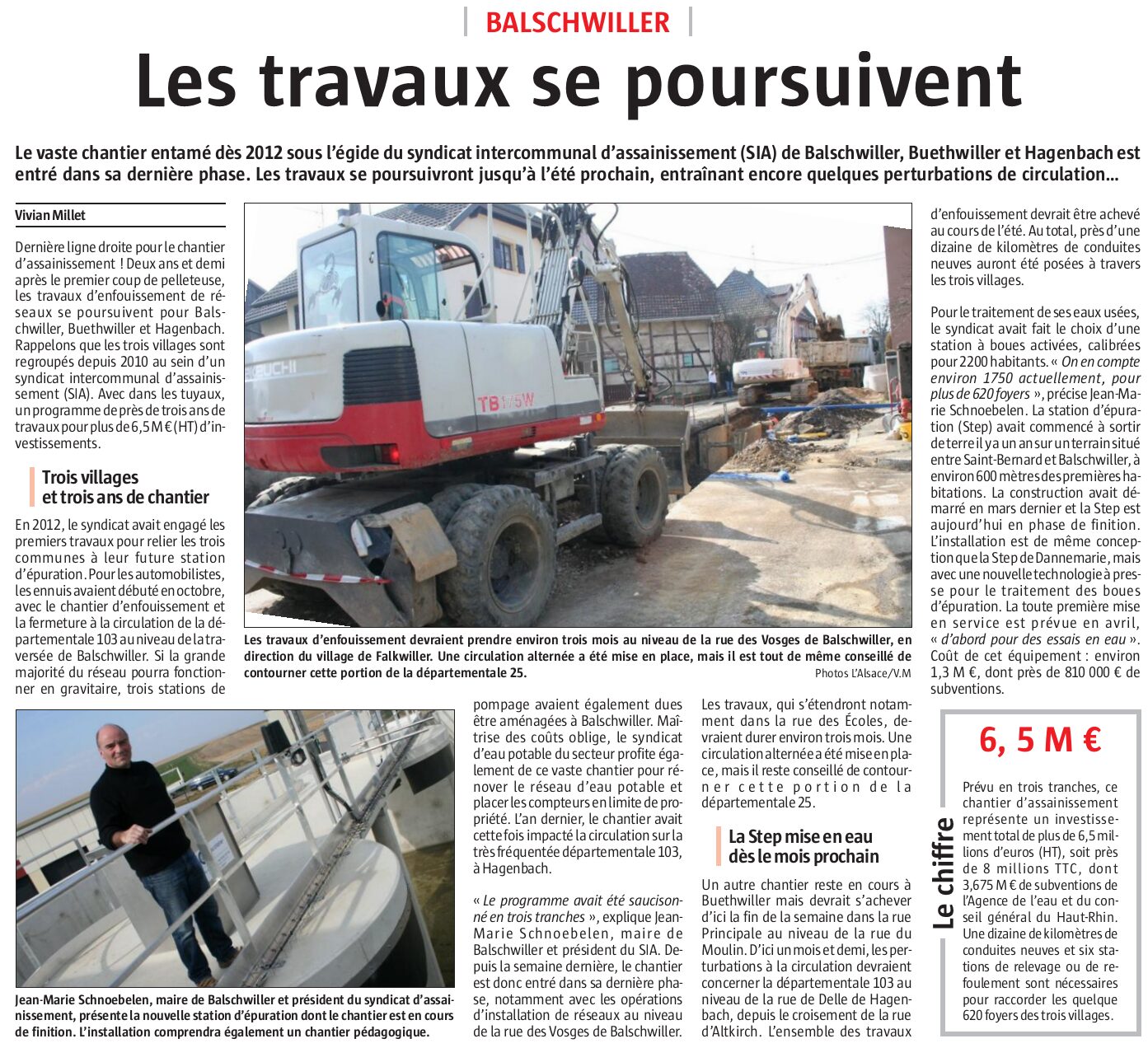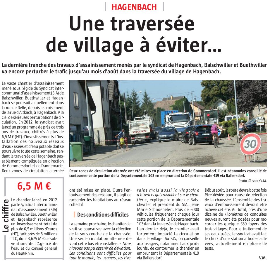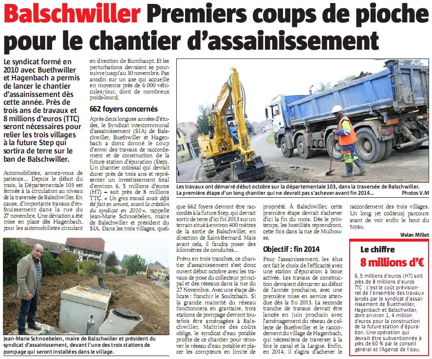 Afin de mutualiser les moyens d’actions, un Syndicat Intercommunal d’Assainissement de BALSCHWILLER – BUETHWILLER – HAGENBACH (SIA-BBH) a vu le jour le 19 novembre 2010. Le Président Jean-Marie SCHNOEBELEN (maire de BALSCHWILLER) secondé par ses deux Vice-présidents, Guy BACH (maire de HAGENBACH) et André ANTZ (maire de BUETHWILLER), aura la charge de mener à bien le projet.