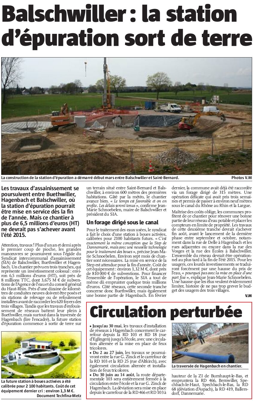 Les communes de BALSCHWILLER, BUETHWILLER et HAGENBACH ont fait le choix de se rapprocher pour aborder ensemble l’important chantier d’assainissement collectif. Les directives européennes et la législation nationale en matière d’environnement imposent aux collectivités territoriales d’organiser le contrôle des installations individuelles de traitement des eaux usées (dans le cadre d’un assainissement non collectif) et/ou la mise en place de collecteurs et de stations de traitement (dans le cadre d’un assainissement collectif).